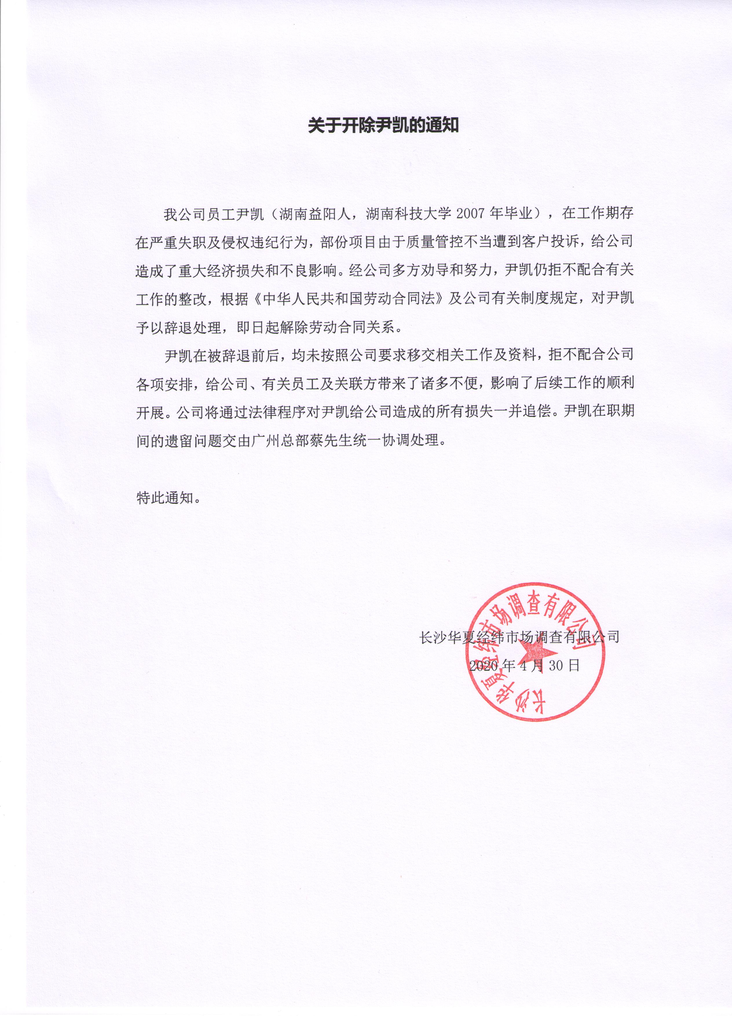 尹凱在被辭退前后,均未按照公司要求移交相關(guān)工作及資料,拒不配合公司各項安排,給公司、有關(guān)員工及關(guān)聯(lián)方帶來了諸多不便,影響了后續(xù)工作的順利開展。公司將通過法律程序?qū)σ鼊P給公司造成的所有損失一并追償。尹凱在職期間的遺留問題交由廣州總部蔡先生統(tǒng)一協(xié)調(diào)處理。